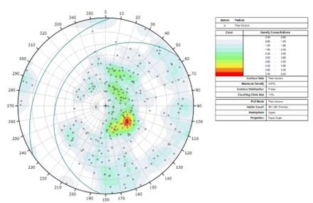 По результатам замеров ориентации трещин был выполнен структурный анализ. Полученные результаты станут основой для районирования карьерного поля по устойчивым параметрам уступов и берм.