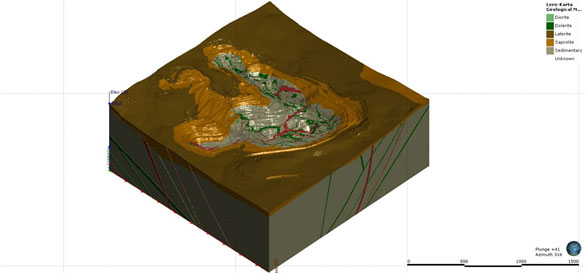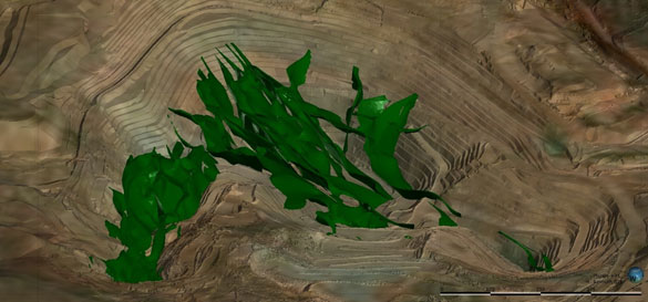 Геологическая модель массива месторождения включает все литологические домены, в том числе слоистость массива, основанную на картировании и ориентированном бурении, а также плоскости тектонических разломов.